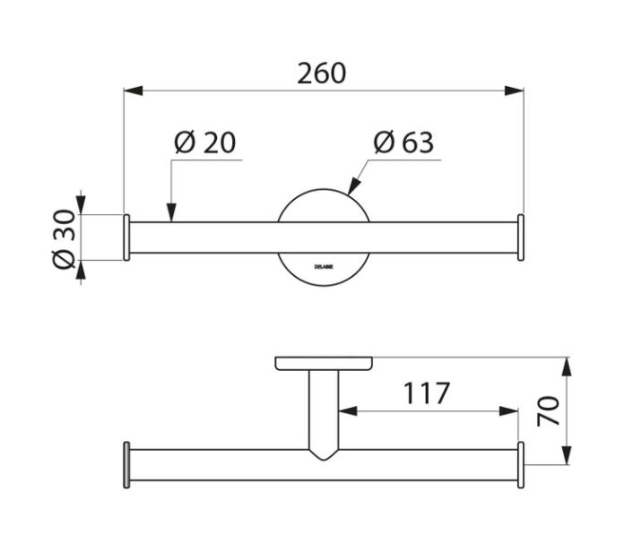 Dubbele toiletpapierrolhouder. Buis Ø 20, dikte 1 mm. RVS 304 mat gepolijst. Verborgen bevestigingen.