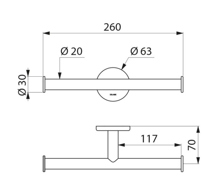 Dubbele toiletpapierrolhouder. Buis Ø 20, dikte 1 mm. RVS 304 geëpoxeerd wit. Verborgen bevestigingen.