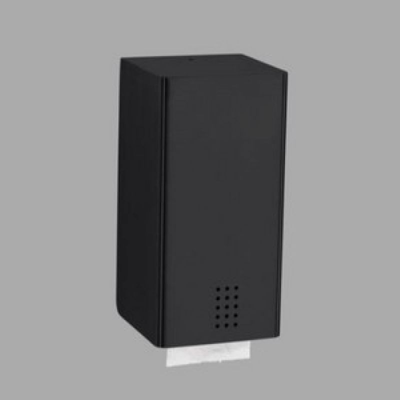 Losse toiletpapierdispenser voor wandmontage. Gemaakt van RVS met zwarte poedercoating in RAL-9005 met fijne structuur. Voorzijde 1,5 mm materiaaldikte. Geperforeerde niveau-indicator met gaten van 4 mm. Sluiting niet zichtbaar van buitenaf. Capaciteit ca. 550 losse vellen. Maximaal mogelijke afmeting van de losse vellen 105 x 120 mm. Inclusief sleutel, RVS schroeven en pluggen.