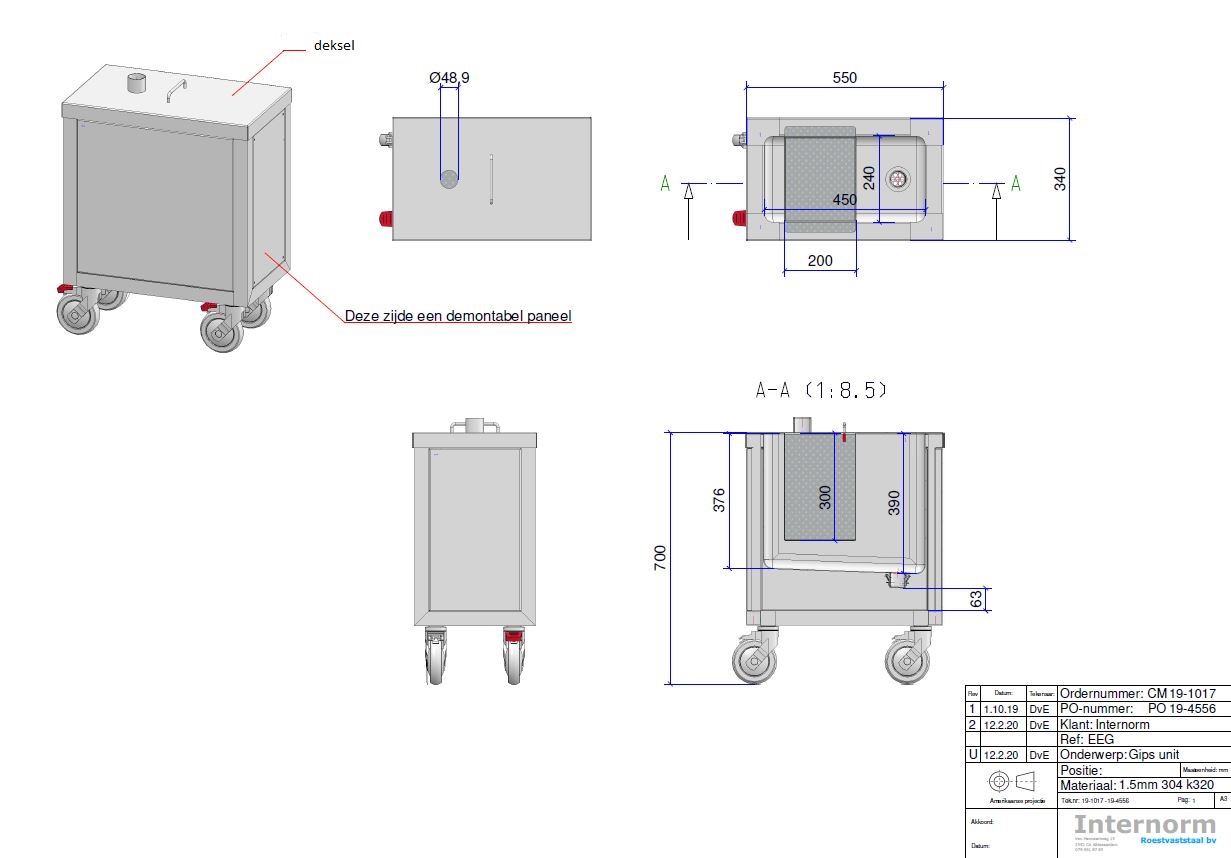 Gipsvanger van RVS AISI 304 voor montage onder afvoer. Incl. consoles. Inhoud 13 liter. Afm. inw. 290x400x200mm. Voorzien van aftapkraan. Incl. 4 zwenkwielen w.v. 2 geremd.