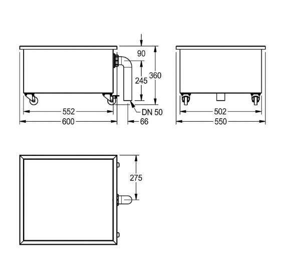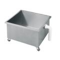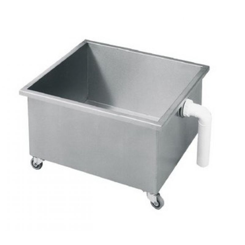 Slibopvangbak 600x550x360mm. RVS 1,25mm, op wielen, vergrendelbaar, met overstroomventiel in de zijwand als afvoer.