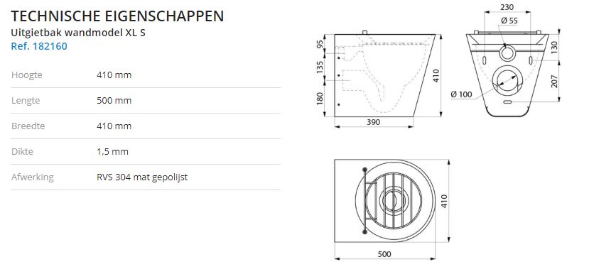 RVS slophopper wandmontage met schanierend rooster. Uitvoering: satin finisch. Afm. 500x410x410(h)mm. Afvoer 100mm. Uitgietbak te bevestigen aan de muur. Bacteriostatisch RVS 304. Gesatineerde afwerking. Dikte RVS: 1,5 mm. Glad oppervlak voor een eenvoudige reiniging. Met spoelrand. Horizontale water inlaat Ø 55 mm. Ingebouwde horizontale afvoer Ø 100 mm. Verborgen evacuatiesysteem: met gesloten onderkant. Snel en eenvoudig te plaatsen: monteren via de voorkant dankzij de bevestigingsplaat in RVS. Scharnierende RVS rooster voor het dragen van een emmer. Bevestigingen meegeleverd.