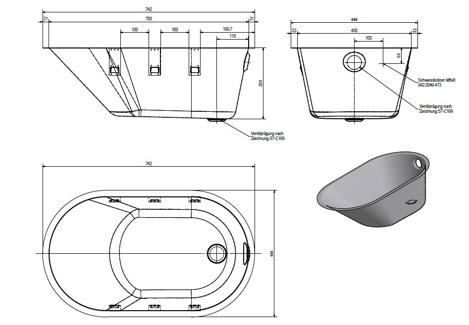 RVS Babybad voor vlakke inleg of onderbouw. Incl. 1,5" afvoerplug, stop, ketting en klemmen. Inw. afm. 700x400x250mm. Met wandoverloop