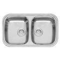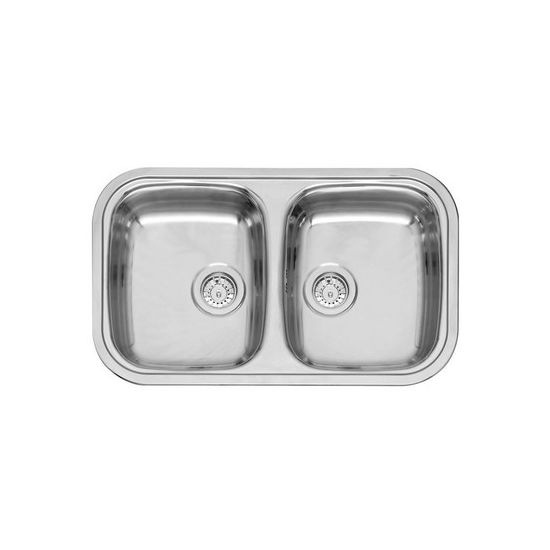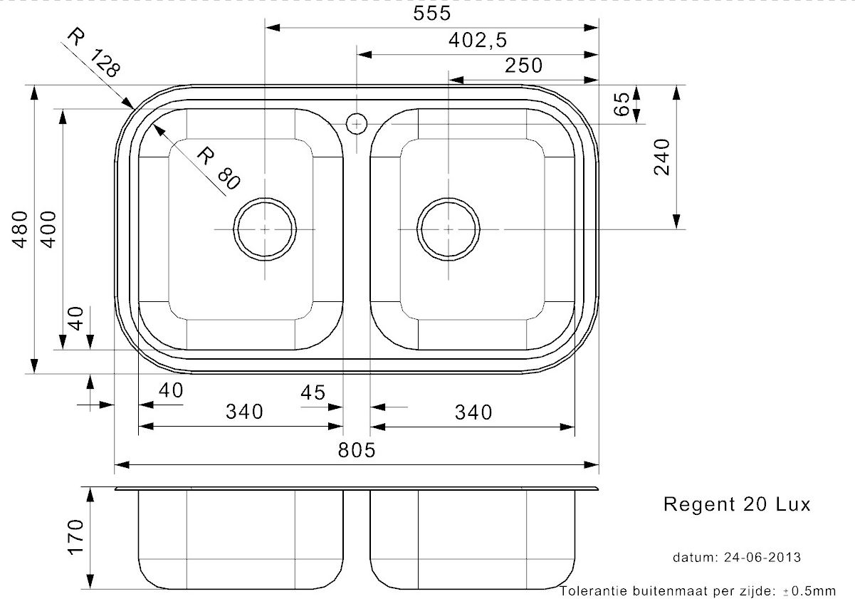 REGENT20LUX RVS 304 opleg spoelunit 2 spoelbakken uitw. 805x480mm bakmaat 340x400/340x400mm. Incl. korfpluggen. Bakdiepte 165mm. Kastmaat 800 mm.