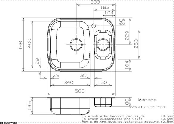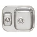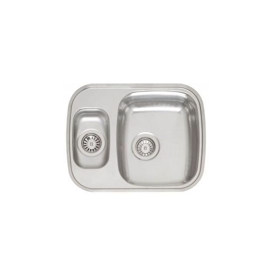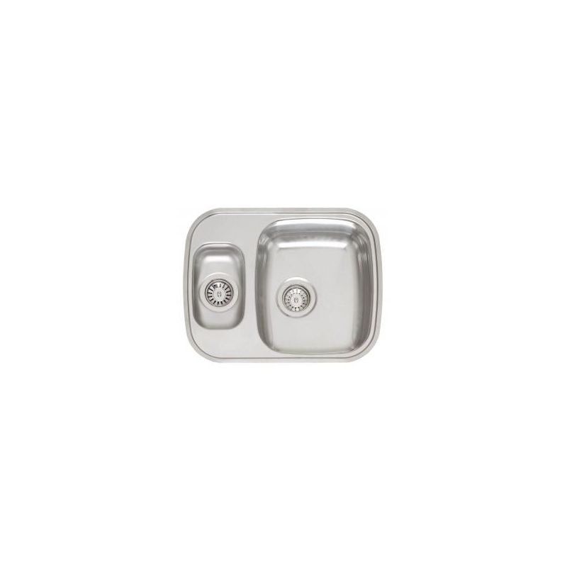 RVS Aanrecht voor opleg met 1 grote en 1 extra kleine spoelbak met 3,5" korfpluggen. Afm. uitw. 583x458mm. Incl. rvs inzetbakje.
