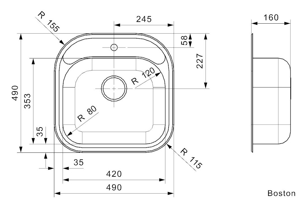 RVS opbouw spoelunit bak met korfplug en kraangat afm. 490x490mm Boston