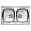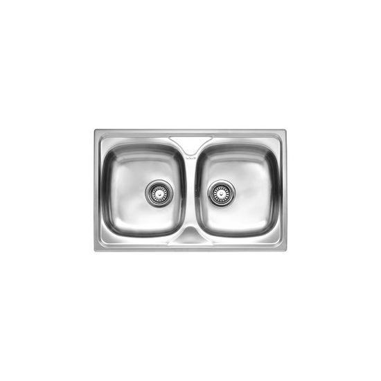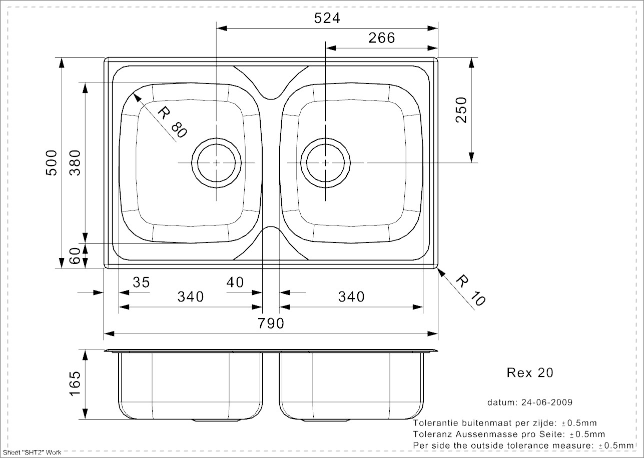 REX20 RVS 304 opbouw spoelunit 2 spoelbakken uitw. 790x500mm met afdruip. Incl. korfpluggen.Bakmaat 340x380/340x380mm Bakdiepte 165mm.Kastmaat 800 mm.