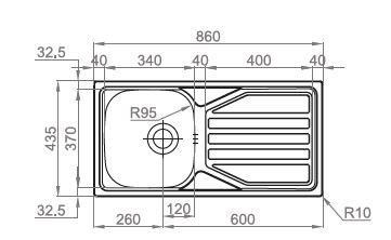 RVS 304 opleg aanrecht 860x435mm met 1 spoelbak 340x370x140mm incl. korfplug met wandoverloop. Omkeerbaar.