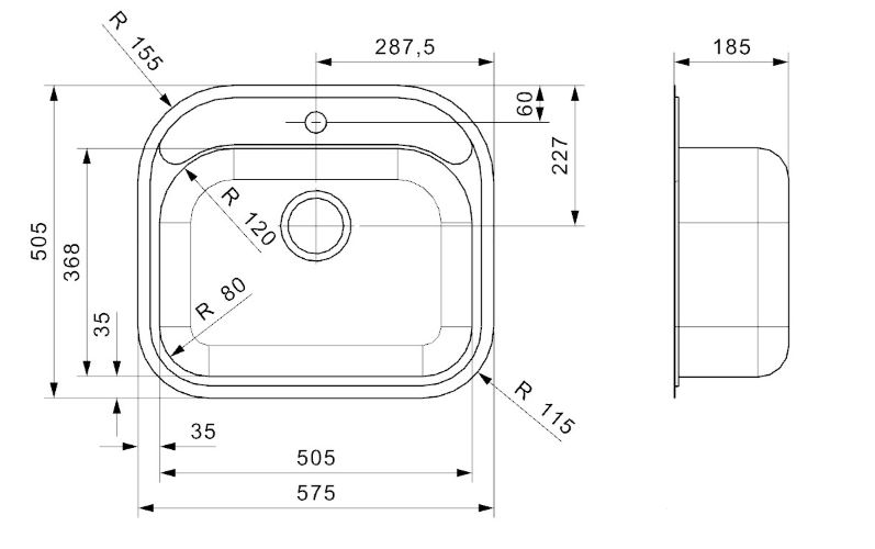 RVS spoelbak voor inleg met een inw. maat 505x368mm met 3,5" korfplug. Afm. uitw. 575x505mm. met kraangat