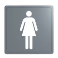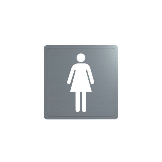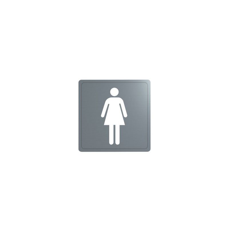 RVS 304 mat gepolijst. Dikte RVS: 1,2 mm. Pictogram "Vrouw". Afmetingen: 125 x 125 mm.