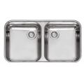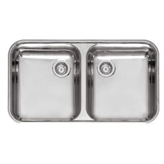 Dubbele vierkante RVS spoelbak, inw. afm. 2 x 405x355x150mm. Voor vlakke inbouw met klemmen, korfpluggen ZONDER wandoverloop.