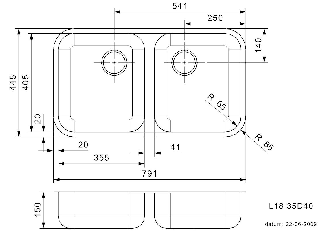 DI3540VKP RVS dubbele spoelbak voor vlakke inleg met korfplug uitw. afm. 791x445mm