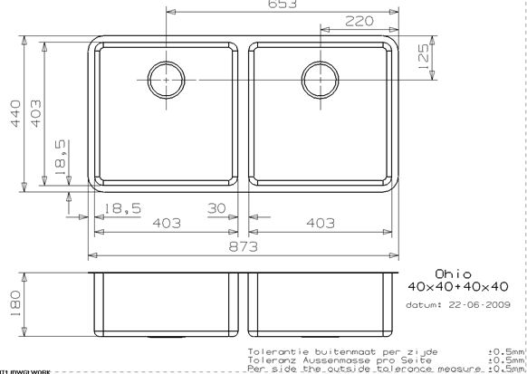 OHIO40x40/40x40 RVS 304 spoelbak 400x400x180mm/400x400x180mm, r=25. Incl. korfplug