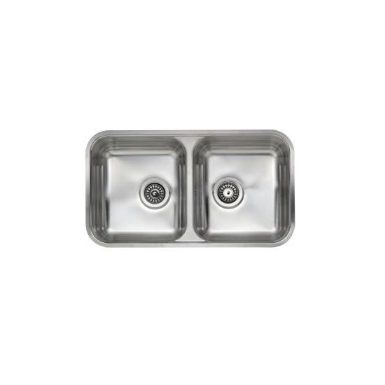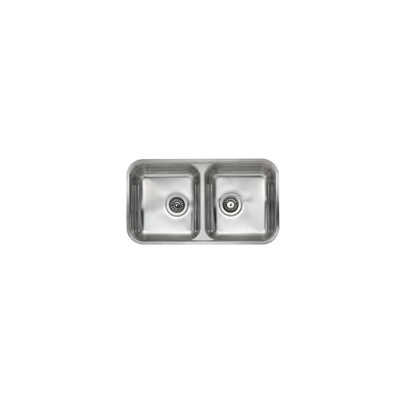 RVS spoelbak, uitw 795x440mm inw. 2 x afm. 405x356x200mm. Voor vlakke inbouw met klemmen en korfplug en wandoverloop.