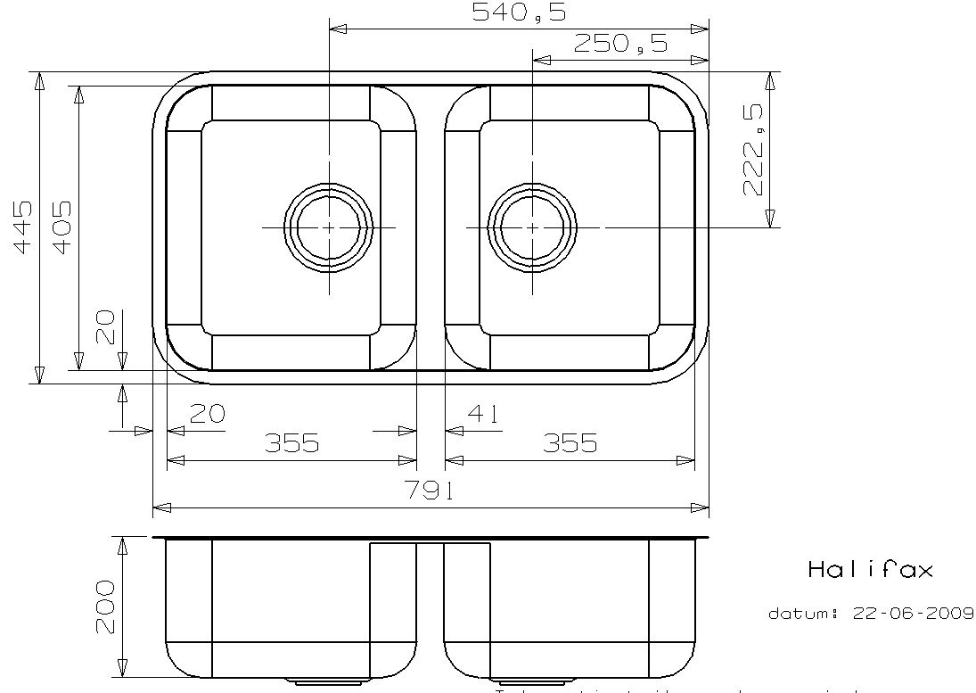 HALIFAX RVS 304 dubbele spoelbak vlak 2x405x353x150mm korfplug