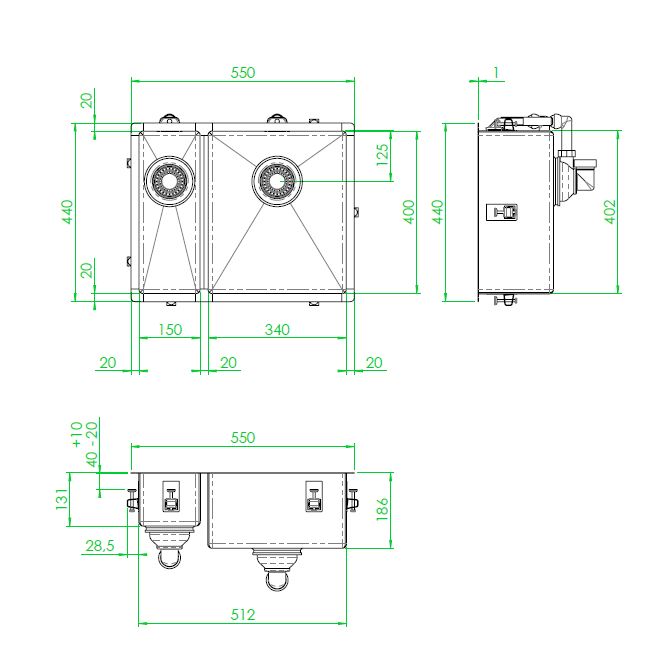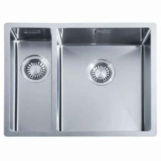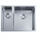 Vlakbouw spoelunit met grote en kleine spoelbak met kleine radius. 340x400x185mm+kleine bak links 150x400x130mm Incl. korfplug met wandoverloop. Uitw, 550x440mm