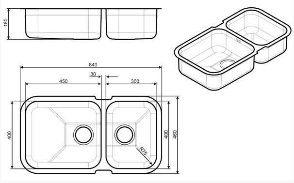 RVS 304 spoelbak dubbel: 1 bak 450x400x180mm, 1 bak 300x400x180mm, Incl. korfpluggen. Geschikt voor 900mm meubel. Inclusief: overloop, garnituur (incl. vaatwasser aansluiting), bevestigingsbeugels.