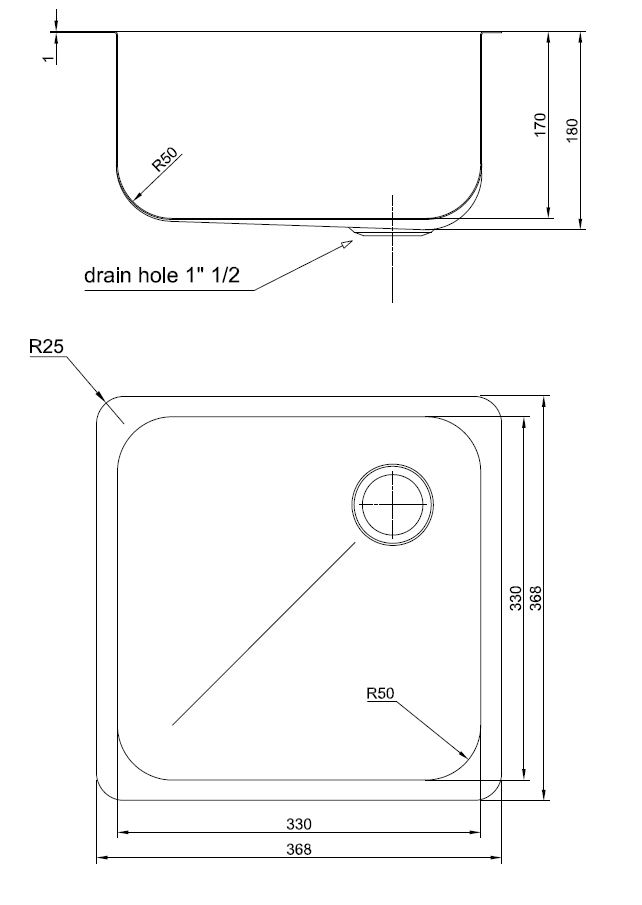 IB330 RVS 304 spoelbak onderbouw inw. 330x330x180mm met 1,5" plug ZO