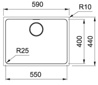 RVS spoelbak inw. afm.550x400x200, inw. R25. Voor onderbouw met klemmen, korfplug en wandoverloop. Uitw. 590x440mm