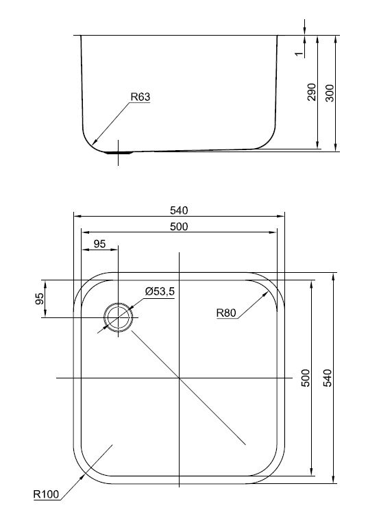 Grote diepgetrokken RVS spoelbak voor vlakke inleg of onderbouw. Afm. inw. 500x500x300mm. Incl. klemmen en 1,5" afvoerplug met standpijp. Radius 80 inw.