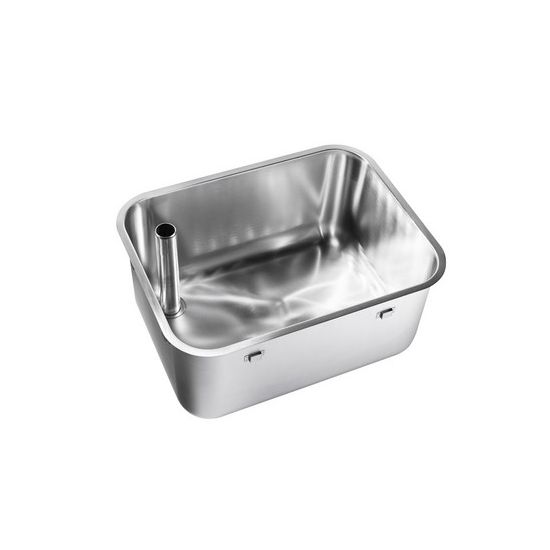 Grote diepgetrokken RVS spoelbak voor vlakke inleg of onderbouw. Afm. inw. 500x400x300mm. Incl. klemmen en 1,5" afvoerplug met standpijp. Links model.