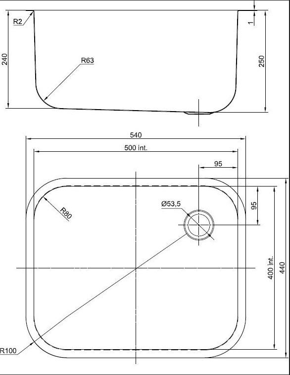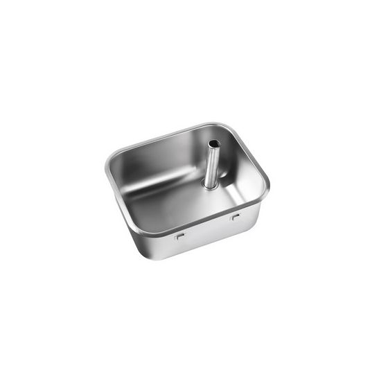 Grote diepgetrokken RVS spoelbak voor vlakke inleg of onderbouw. Afm. inw. 500x400x250mm. Incl. klemmen en 1,5" afvoerplug met wo. Rechts model. Radius 80 inw.