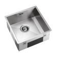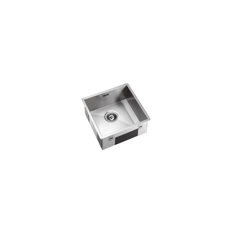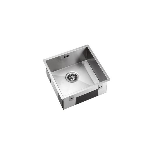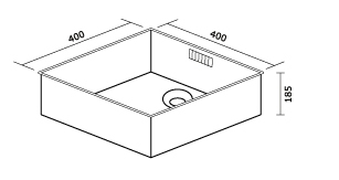 RVS Spoelbak met haakse hoeken voor vlakke inbouw. Afm. inw. 400x400x185 mm, incl. korfplug en wandoverloop