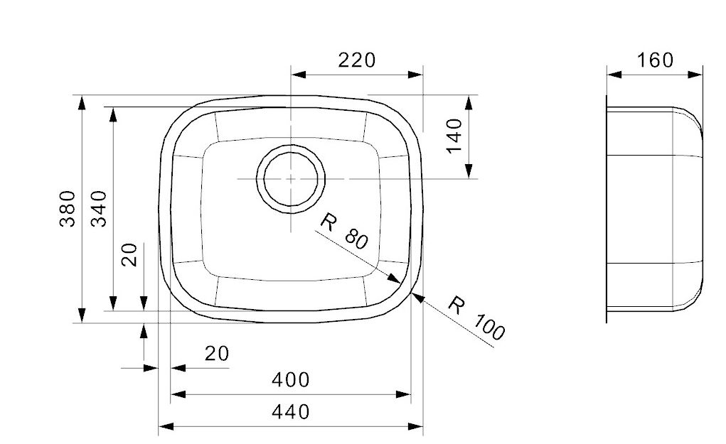 EI3440VKP RVS spoelbak 400x340x150mm vlakke rand met korfplug