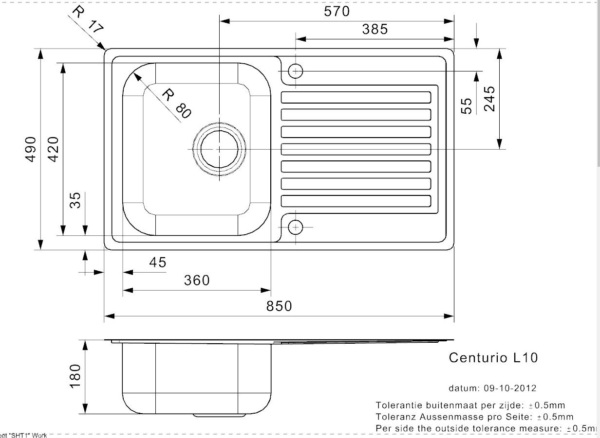 Centurio L10 RVS 304 vlakke inleg spoelunit enkele bak met afdruip uitw. 850x490mm
