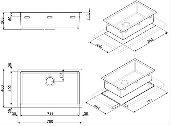 RVS 304 spoelbak uitw. 760x460x200mm inw.710x400x200mm, radius hoeken 15mm, incl. korfplug 3,5” Zonder overloop. Geschikt voor 800mm meubel.