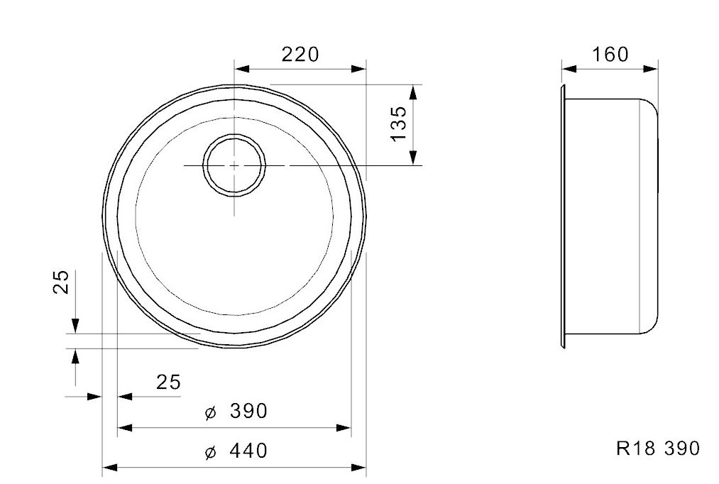 RI390KP COMFORT RVS ronde spoelbak voor opleg inw.390mm met korfplug