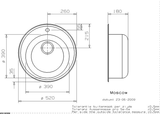 Moscow RVS 304 ronde opbouw spoelbak met kraangat. Uitw. 520mm, inw. 390mm.
