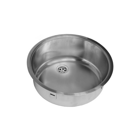 Ronde RVS spoelbak voor vlakke inleg. Compleet met vastzetklemmen, 1,5" afvoerplug met stop, zonder wandoverloop. Inwendig 390mm, uitw. 440mm. diepte 160mm