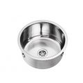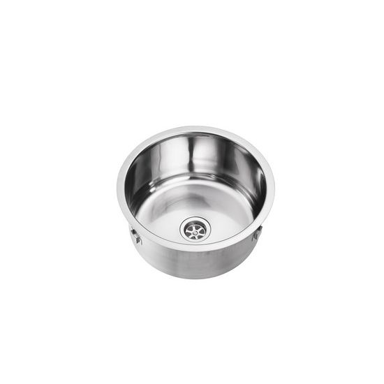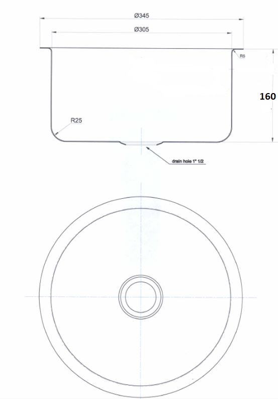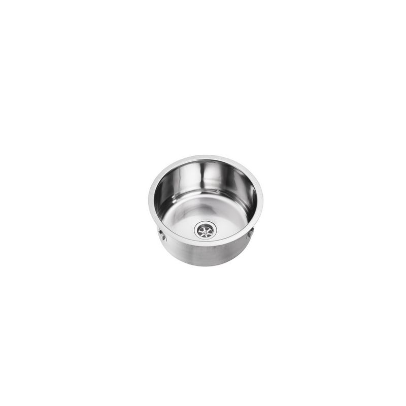 Ronde spoelbak voor vlakke inleg. Compleet met vastzetklemmen, 1,5" afvoerplug. Inwendig 300 mm. uitw. 345 mm, diepte 165mm. Zonder wandoverloop.