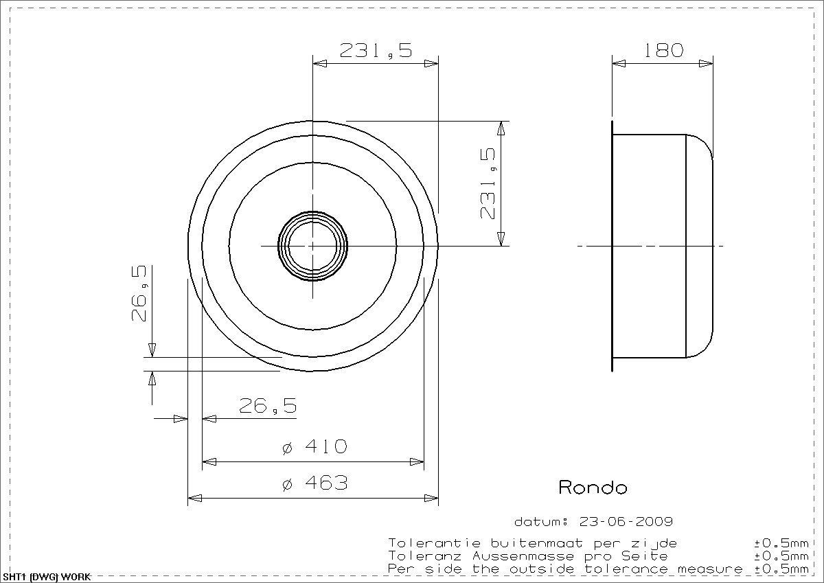 RONDOLUX RVS 304 ronde spoelbak uitw. 463mm inw. 410mm.