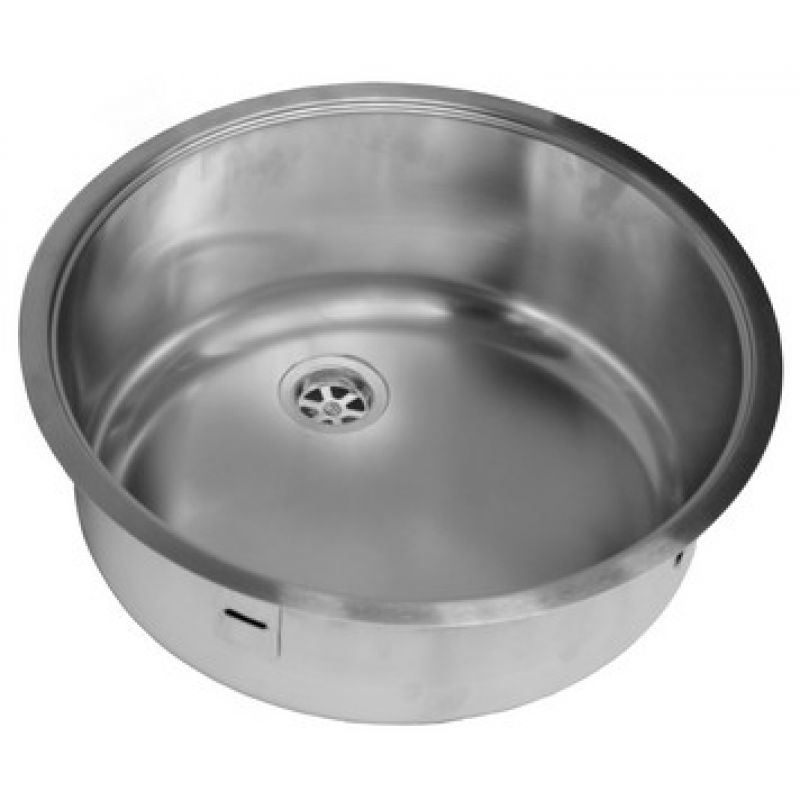 Ronde RVS 316 spoelbak voor vlakke inleg. Compleet met vastzetklemmen, 1,5" afvoerplug zonder wandoverloop (zeefje plug is RVS 304). Inwendig 390mm, uitw. 440mm.