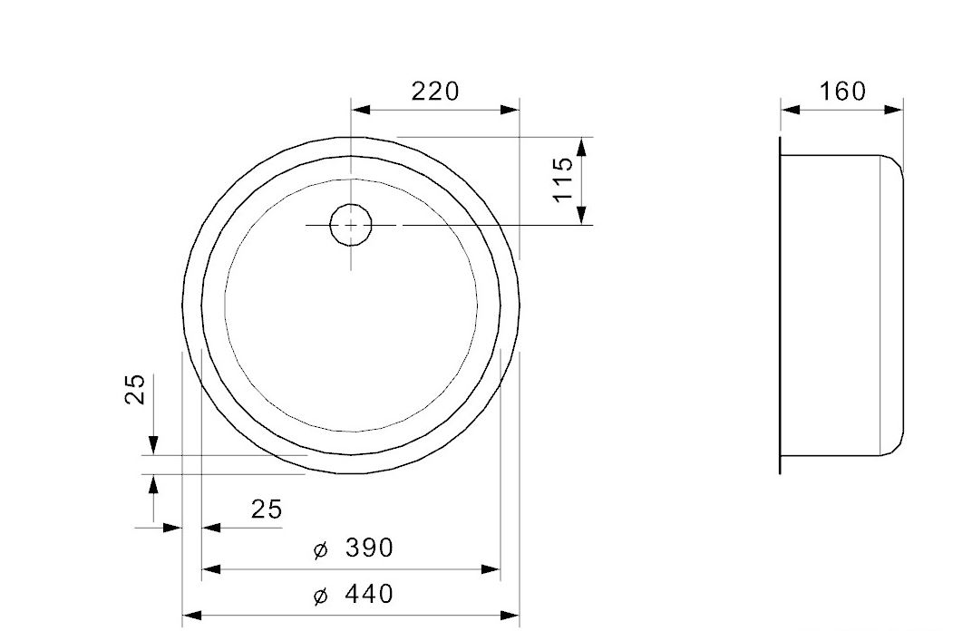 316RI390VZO RVS 316 ronde spoelbak vlak 390mm. Incl. 1,5" plug (zeefje RVS 304)