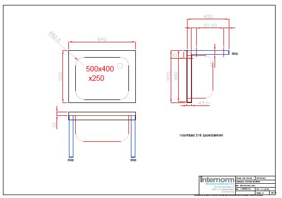 RVS 316 spoelbak 640x500mm (bak 500/400/250). Incl. consoles RVS 304. Optie standpijp. Incl. afvoerplug p.p.