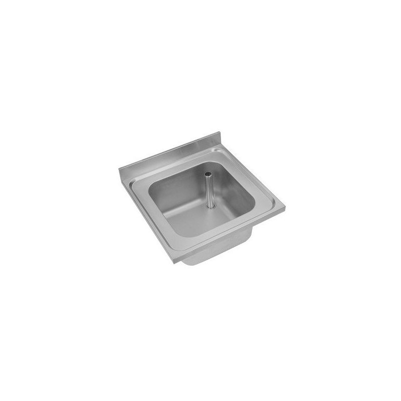 Grote RVS spoelbak voor wandmontage of montage op onderkast of frame. Achterzijde blokprofiel 100mm hoog. Bakmaat 500x400x250mm compleet met 1,5" afvoerplug en standpijp.