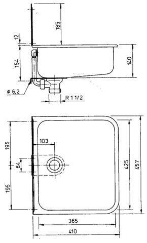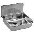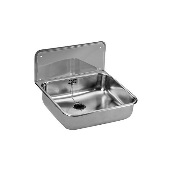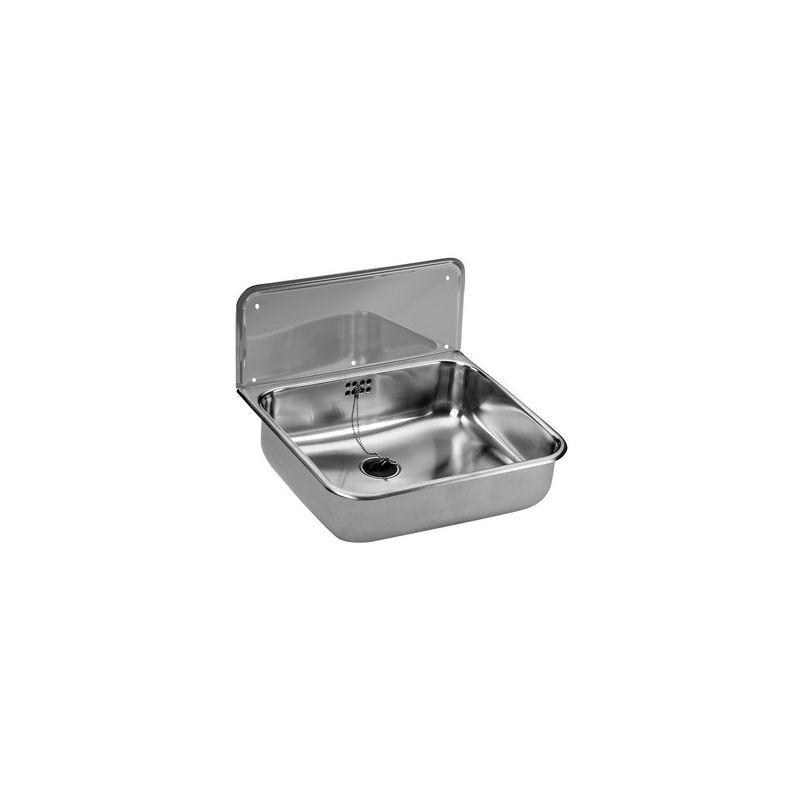 Kleine RVS spoelbak met vlakke bodem met 1,5" afvoerplug, overloop, stop en ketting, 1 middenconsole en spatplaat 185mm hoog. Afm. 457x410x140mm. Optie: emmerrooster (340.012)