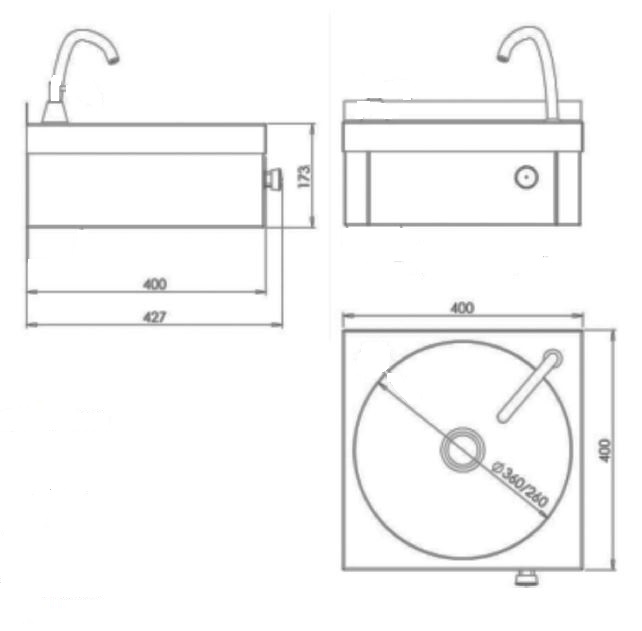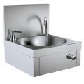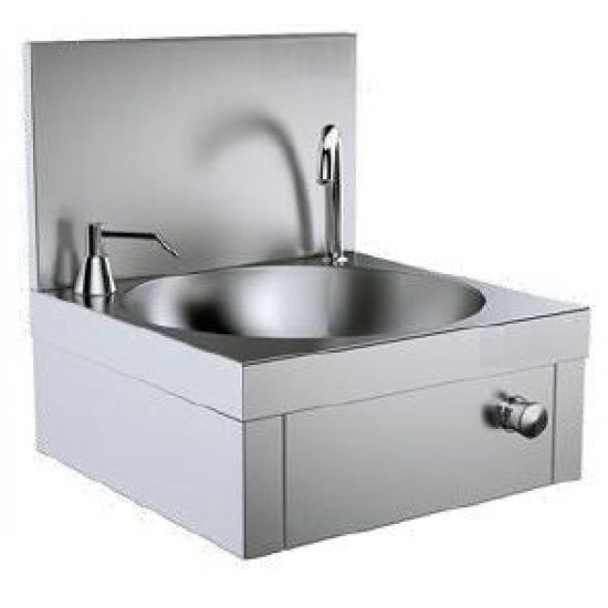 Kniebediende RVS spoelbak voor wandmontage met uitloop. Uitw. afm. 400x400x175mm. Inw. diam 360/260mm. Incl. uitloop, excl. mengventiel. Optie: spatplaat en zeepdispenser.