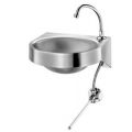 Handwasbakje met kniebediening, te bevestigen aan de muur. Bacteriostatisch RVS 304. Gesatineerde afwerking. Dikte RVS: 1,2 mm. Onscherpe afwerking. Geleverd met een uitloop met zwanenhals en een zelfsluitende kraan met zelfsluiting na 7 seconden. Geleverd met afvoer 1"1/4. Zonder overloop. Bevestigingen meegeleverd. CE keurmerk. Conform de norm EN 14688. Gewicht: 5 kg.