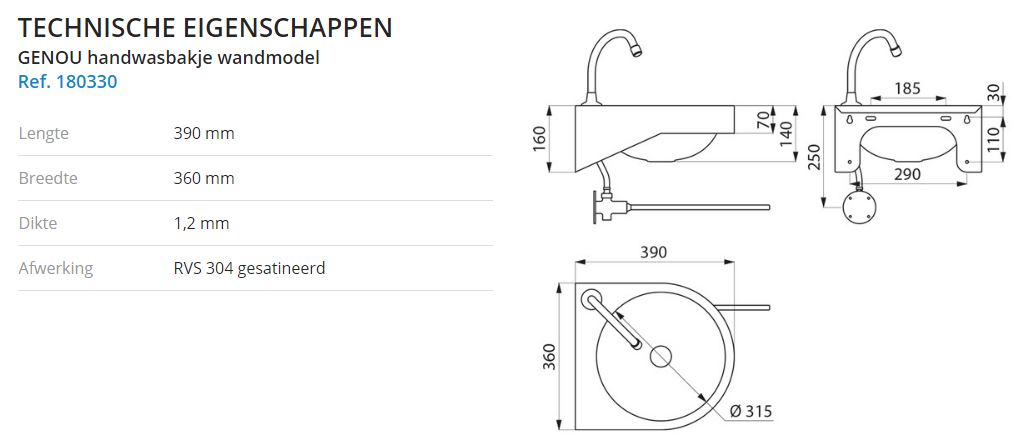 180330 RVS handwasbak afm. 360x390mm kniebediening Satin Finish GENOU