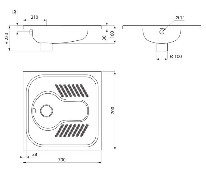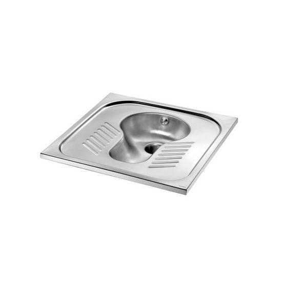 Hurktoilet in te bouwen in de vloer, 700 x 220 x 700 mm. Bacteriostatisch RVS 304. Mat gepolijste afwerking. Dikte RVS: 1,2 mm. Geperste kom, zonder lasnaden, voor een eenvoudig onderhoud en een betere hygiëne. De vorm van de kom is universeel. Antislip bodem waar de voeten moeten staan. Verticale afvoer: Ø 100 mm. Spoelsysteem met 1 sproeikop in RVS 304.Gewicht: 6 kg.10 jaar garantie. Turkish Squads