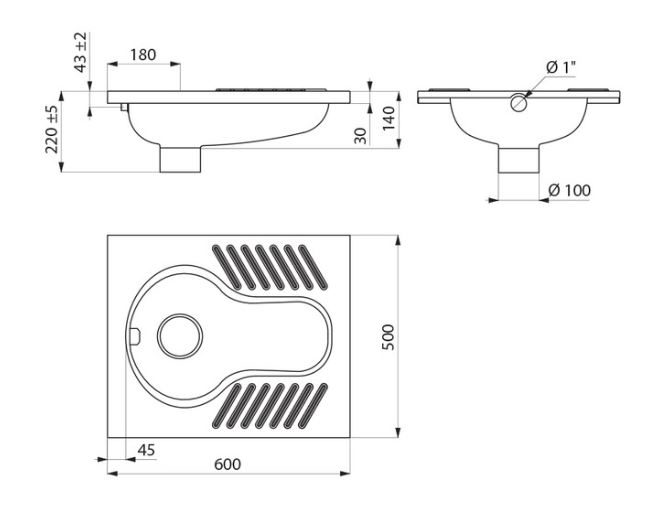 Hurktoilet in te bouwen in de vloer, 500 x 220 x 600 mm. Bacteriostatisch RVS 304. Mat gepolijste afwerking. Dikte RVS: 1,2 mm. Geperste kom, zonder lasnaden, voor een eenvoudig onderhoud en een betere hygiëne. De vorm van de kom is universeel. Antislip bodem waar de voeten moeten staan. Verticale afvoer: Ø 100 mm. Spoelsysteem met 1 sproeikop in RVS 304. Gewicht: 5 kg. 10 jaar garantie. Turkish Squads