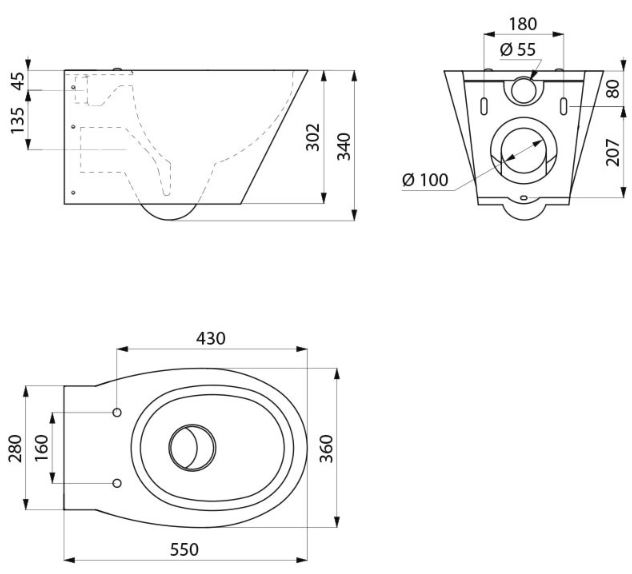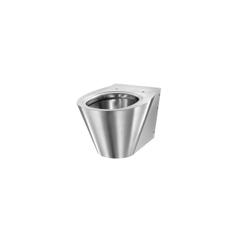Hangtoilet, 360 x 375 x 550 mm. Kan geplaatst worden op elk standaard voorwandsysteem, beschikbaar in de markt. Elegant en strak design. Bacteriostatisch RVS 304. Mat gepolijste afwerking. Dikte RVS: 1,5 mm. Geperste kom, zonder lasnaden, voor een eenvoudig onderhoud en een betere hygiëne. De binnenkant van de kom is gepolijst en de randen zijn afgerond voor een gemakkelijke reiniging. Met spoelrand. Horizontale toevoer Ø 55 mm. Horizontale afvoer Ø 100 mm. Waterbesparing: efficiënte werking met 4 L water of meer. Toilet met gesloten onderkant. Voorzien van boorgaten voor het plaatsen van een toiletzitting. RVS afdekdopjes worden meegeleverd voor gebruik zonder bril. Snel en eenvoudig te plaatsen: monteren via de voorkant dankzij de bevestigingsplaat in rvs.