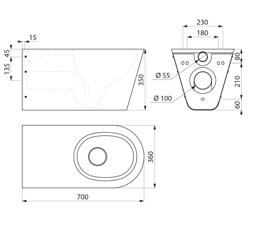 RVS 304 wandcloset satin finish. Afm. 700x360x350(h)mm. Geschikt voor mindervaliden. Met voorgeboorde gaten tbv zitting. Past op inbouwreservoir. Hangtoilet. Verlengd model 700 mm voor een beter comfort voor mindervaliden. Kan geplaatst worden op elk standaard voorwandsysteem, beschikbaar in de markt. Elegant en strak design. Bacteriostatisch RVS 304. Gesatineerde afwerking.Dikte RVS: 1,5 mm. Geperste kom, zonder lasnaden, voor een eenvoudig onderhoud en een betere hygiëne. De binnenkant van de kom is gepolijst en de randen zijn afgerond voor een gemakkelijke reiniging. Met spoelrand. Water inlaat horizontaal Ø 55 mm. Horizontale afvoer Ø 100 mm. Waterbesparing: efficiënte werking met 4 L water of meer. Toilet met gesloten onderkant. Voorzien van boorgaten voor het plaatsen van een toiletzitting. RVS afdekdopjes worden meegeleverd voor gebruik zonder bril. Snel en eenvoudig te plaatsen: monteren via de voorkant dankzij de bevestigingsplaat in RVS. Geleverd met bevestigingsplaat en 6 anti-diefstal schroeven TORX. CE keurmerk. Conform de norm EN 997 voor een spoeling van 4 L.Gewicht: 14,5 kg.