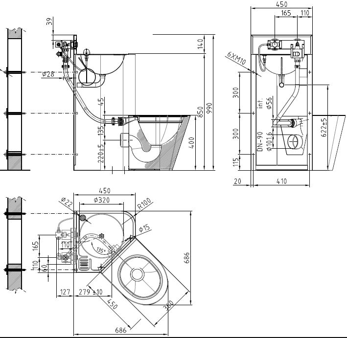 De toilet combinatie omvat bovenblad met ronde waskom met afvoerplug, tapkraan en zeepschaal. Closet met 'P' sifon. Het spoelventiel voor het toilet is opgenomen in de combinatie. Spoeling 4-6 lt, min 2 bar. Uitvoering links of rechts