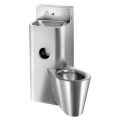 Combi wastafel en hangtoilet links met ingebouwde toiletpapierhouder. Wandmodel met 3 inspectieluiken, 2 op de zijkant en 1 op de bovenkant, met anti-diefstal schroeven TORX. Bacteriostatisch RVS 304. Gesatineerde afwerking. Dikte RVS van het blok: 2 mm. Afgeronde hoeken en randen voor een betere veiligheid. Glad oppervlak voor een gemakkelijke reiniging. Geschikt voor gebruik in gevangenissen, politiekazernes... De WC is volledig gelast aan de wastafel, geen schroeven: vergemakkelijkt het reinigen en verhindert het verbergen van objecten. Geleverd met een zelfsluitende wastafelkraan: onschendbare drukknop in RVS met anti-blokkeerveiligheid, zelfsluiting na 7 seconden, M1/2". WC uitgerust met een zelfsluitende kraan, zelfsluiting na 7 seconden, M3/4". Water inlaat: wastafel M 1/2", WC M3/4". Geïntegreerde horizontale afvoer Ø 100 mm. Geleverd met sifon voor wastafel. Vereenvoudigde plaatsing: één enkele afvoer voor WC en wastafel, water inlaat en afvoer reeds gekoppeld. Gewicht: 36 kg.