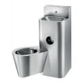 Combi wastafel en hangtoilet links met ingebouwde toiletpapierhouder. Wandmodel met 3 inspectieluiken, 2 op de zijkant en 1 op de bovenkant, met anti-diefstal schroeven TORX. Bacteriostatisch RVS 304. Gesatineerde afwerking. Dikte RVS van het blok: 2 mm. Afgeronde hoeken en randen voor een betere veiligheid. Glad oppervlak voor een gemakkelijke reiniging. Geschikt voor gebruik in gevangenissen, politiekazernes... De WC is volledig gelast aan de wastafel, geen schroeven: vergemakkelijkt het reinigen en verhindert het verbergen van objecten. Geleverd met een zelfsluitende wastafelkraan: onschendbare drukknop in RVS met anti-blokkeerveiligheid, zelfsluiting na 7 seconden, M1/2". WC uitgerust met een zelfsluitende kraan, zelfsluiting na 7 seconden, M3/4". Water inlaat: wastafel M 1/2", WC M3/4". Geïntegreerde horizontale afvoer Ø 100 mm. Geleverd met sifon voor wastafel. Vereenvoudigde plaatsing: één enkele afvoer voor WC en wastafel, water inlaat en afvoer reeds gekoppeld. Gewicht: 36 kg.